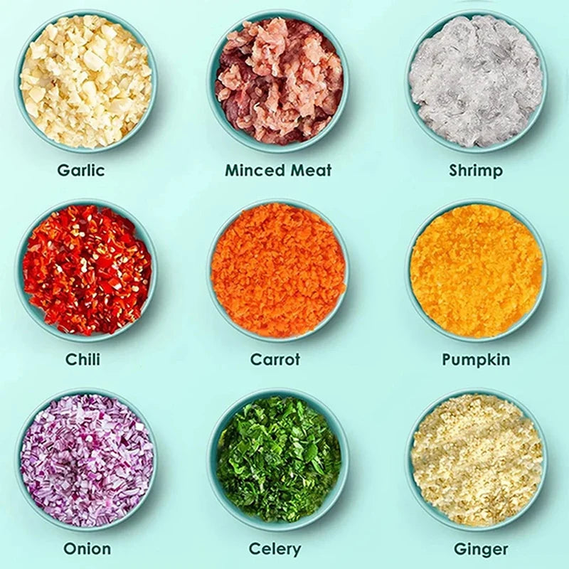 3. Quick Chop: The sharp blade of the garlic chopper can quickly chop garlic, spices, nuts, vegetables, meat, ice cubes, etc. It is very suitable for small foods. You can use it for cooking, supplementing baby food, smoothie drinks.